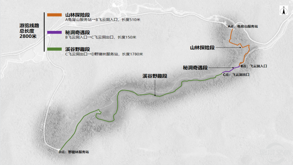 “三段”是山林探险段、秘洞奇遇段、溪谷野趣段。山林探险段位于龟背山服务站与飞云洞入口之间,长度520米。游客在龟背山服务站更换探险装备后,在教练的带领下,首先进入龟背山原始森林,林中古藤缠绕,游如巨蟒,它们或盘根错节,或抱着巨石生长,因此又称“石上森林”。沿栈道设置有多个植物科普研学装置,感受自然生命的坚强与神奇。走出石上森林来到飞云瀑下,沿着一段高差65米的“飞云纵”石阶攀援而上方能到达飞云洞。
