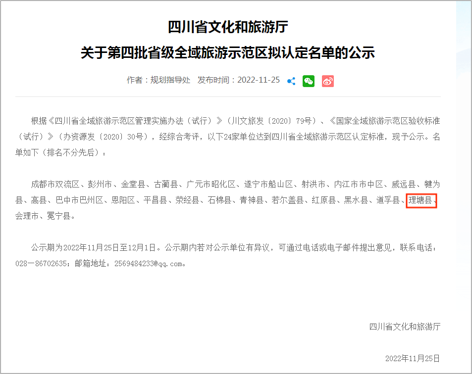8月21日,四川省文化和旅游厅官网发布公示,根据《关于开展天府旅游名县建设的实施意见》《关于进一步做好天府旅游名县建设工作的通知》《关于做好下一阶段天府旅游名县评选有关工作的通知》和《天府旅游名县评选办法(修订)》《天府旅游名县考核评分细则(修订)》等相关规定与要求,通过自愿申报、资格审查、考核验收等程序,按照“客观公正、统一考评、从优遴选、兼顾地域”的原则,经四川省文化和旅游产业领导小组2023年全体会议审议通过,拟命名崇州市、雅安市名山区、兴文县、南充市高坪区、万源市、射洪市、理塘县、绵阳市安州区等8个单位为“第五批天府旅游名县”。